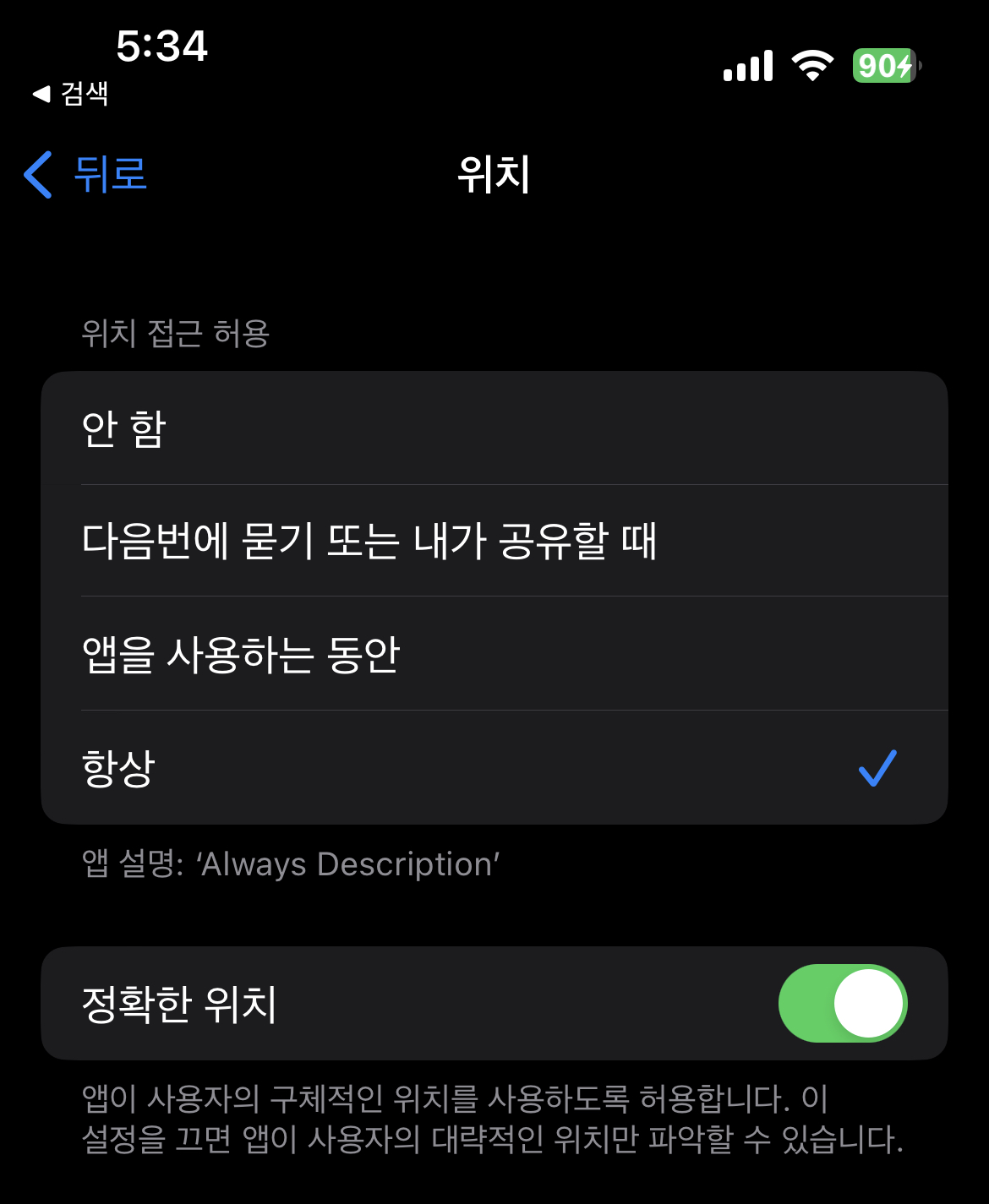 When In Use때랑 달라진것은.. 항상 옵션이 추가되었고, 앱 설명 부분도 Always것을 쓰네요.