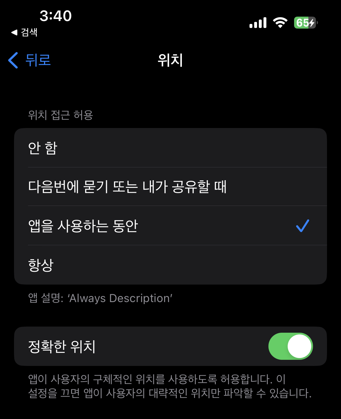 3. 설정에는 앱을 사용하는 동안으로 체크되어있음