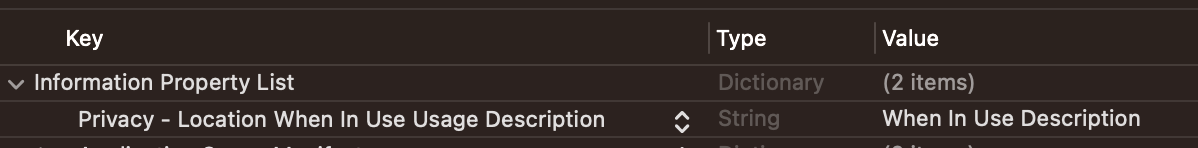 - NSLocationWhenInUseUsageDescription