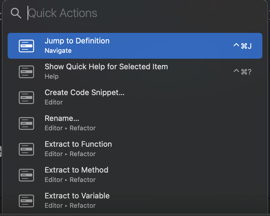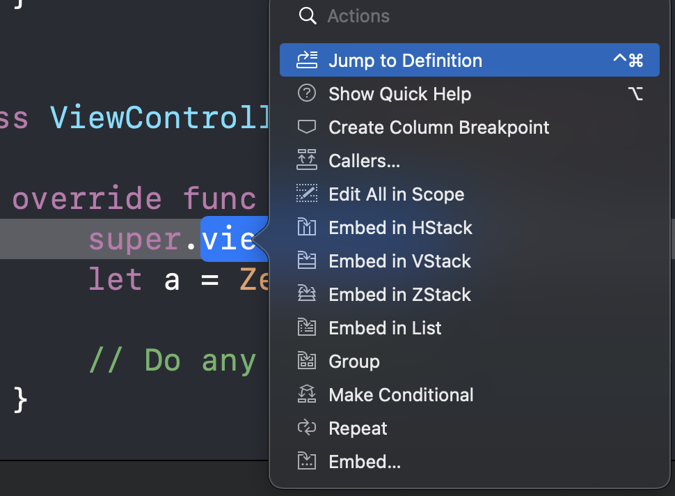 Definition로 가려면 여기서 Jump to Definition 선택하거나, control + command + 클릭 해야함