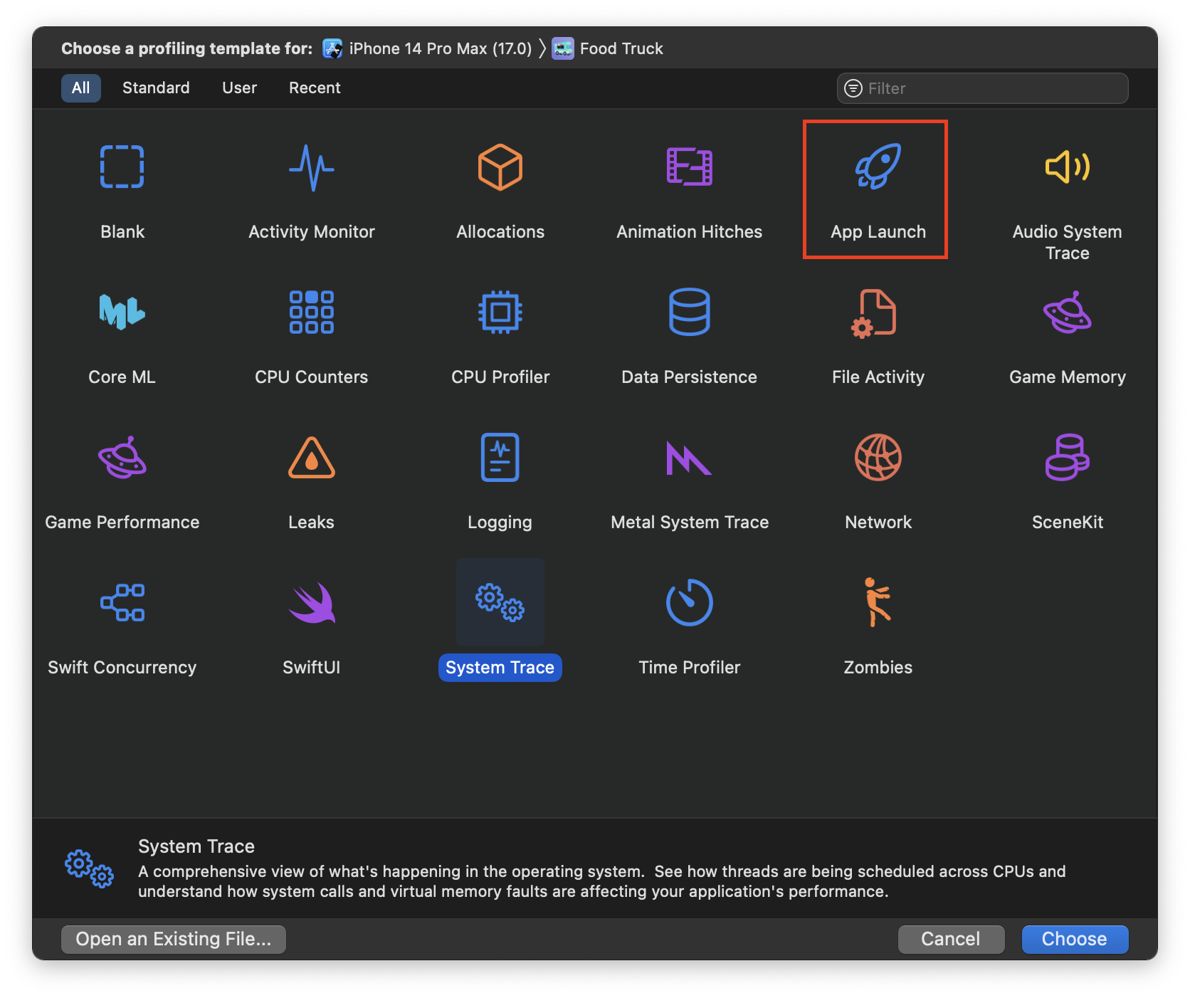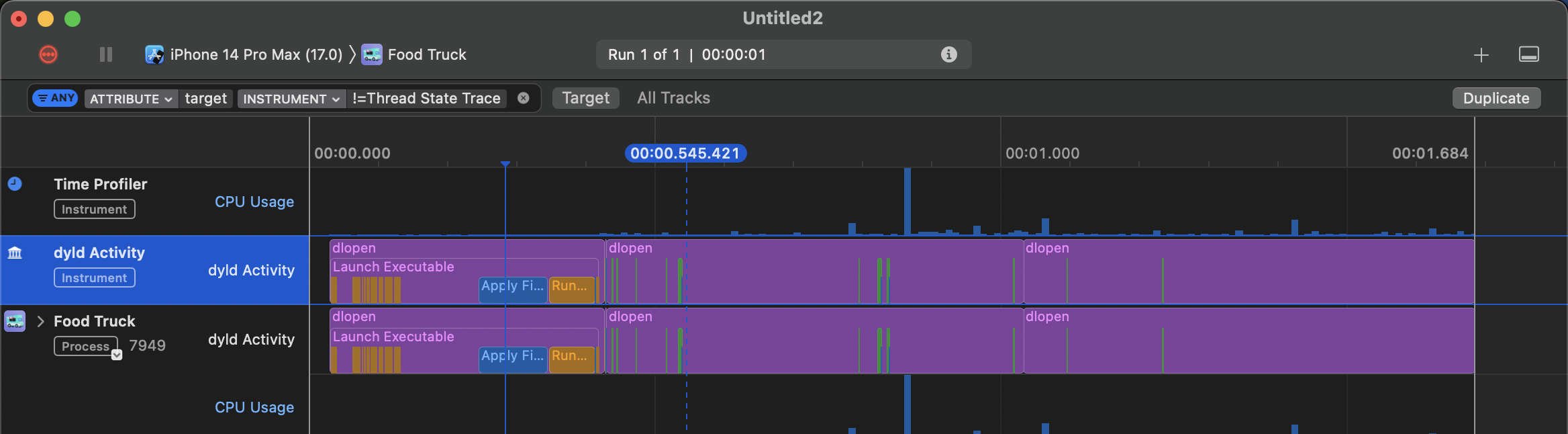 - 앱 시작 프로파일링과 관련된 static initializers 및 기타 dyld 통계를 시각화하는 dyld Activity가 App Launch 템플릿에 포함되어있음