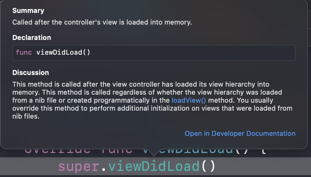 - Xcode는 모듈 이름에 대한 참조에서 Quick Help를 호출하여 SDK프레임워크 문서에 접근할 수 있도록 지원.