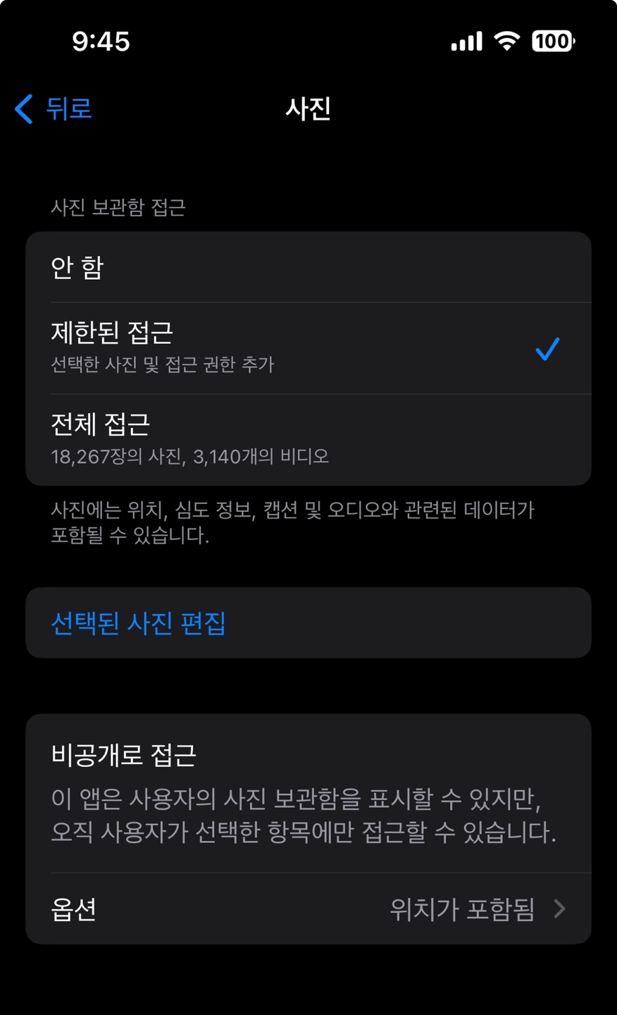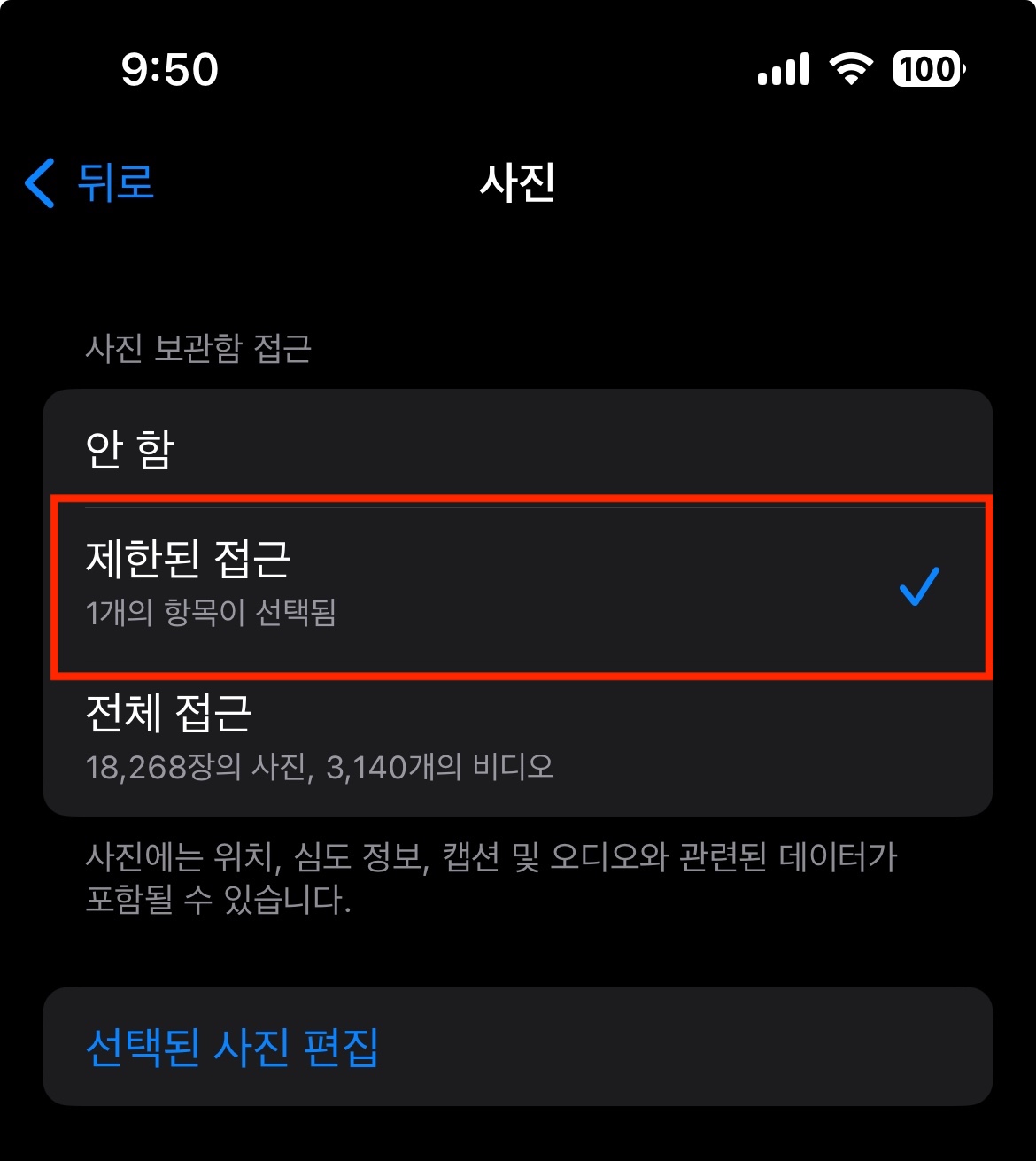 선택된 사진 편집을 눌러서 사진들을 선택하고 해당 사진들에게만 접근 권한을 추가할 수 있다.