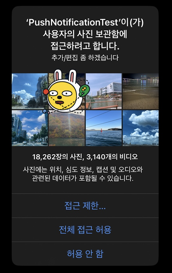 암튼 이 PHPicker를 띄우고, PHPicker가 모든 Asset들을 보여주는것에 대해서는 따로 권한이 필요없다.