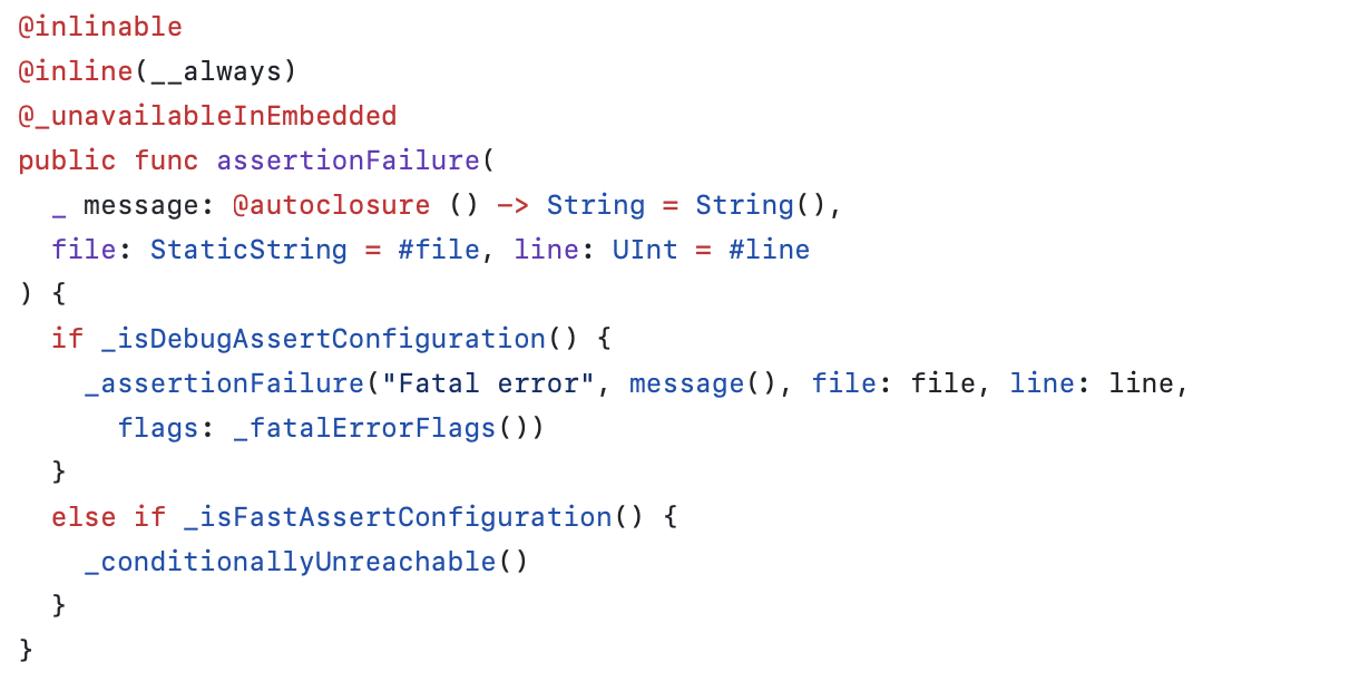 assertionFailure은 assert와 동작하는 환경자체는 같은데, condition이 없는 것을 볼 수 있다.