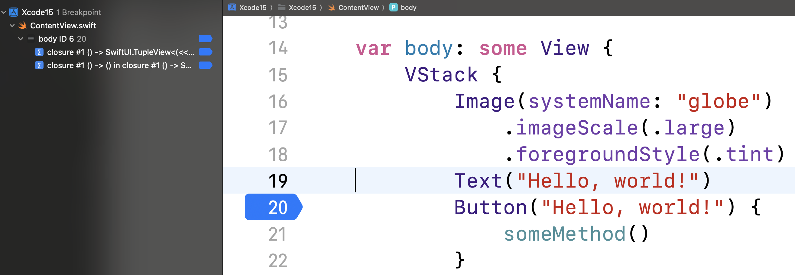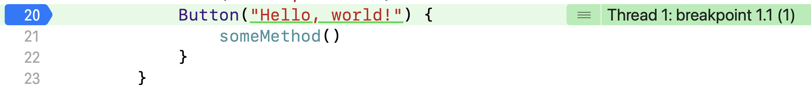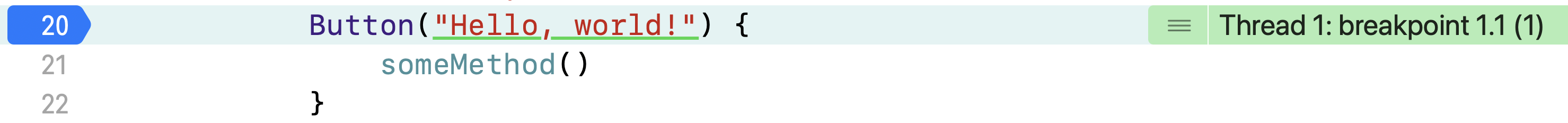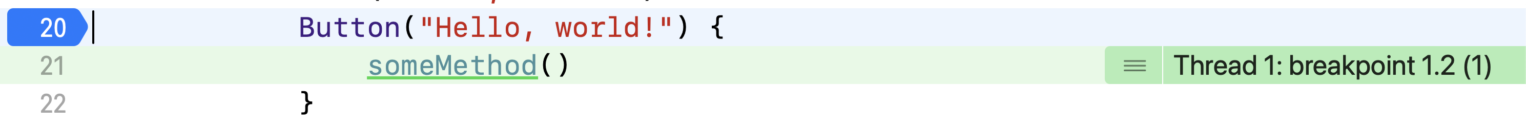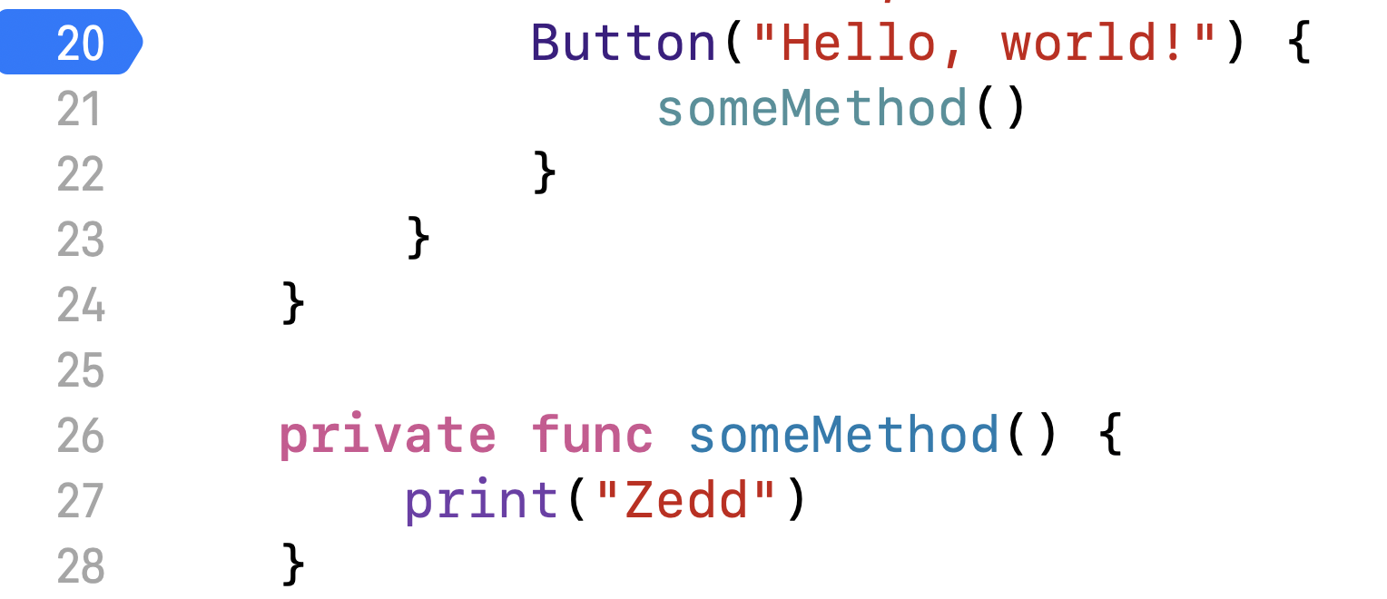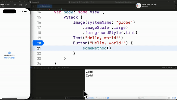위 코드는 Hello, world!라는 Button을 누르면 someMethod가 실행되는데, 버튼을 한번 눌러보겠다!!!