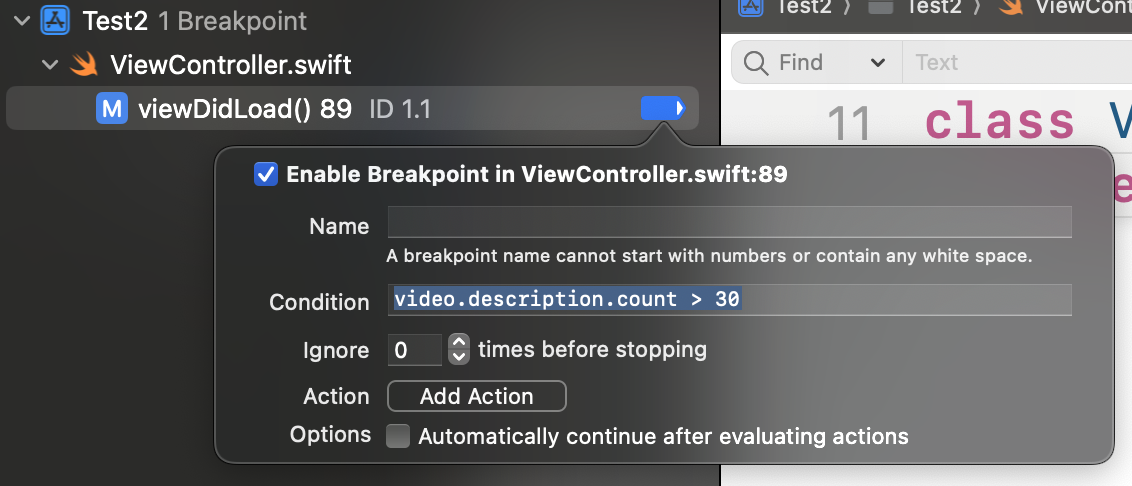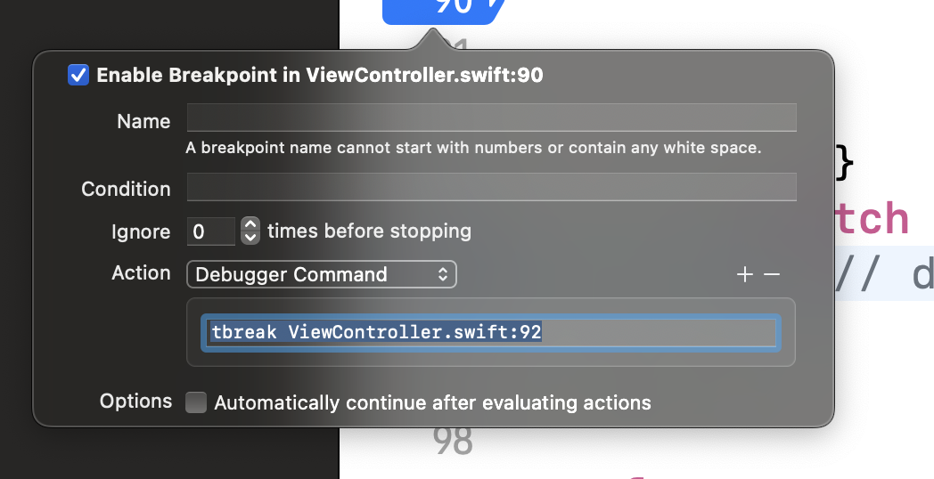 사진처럼 Edit breakpoint에 들어가서 하는 방법도 편하긴한데.. 나는 그냥 lldb에서 하는게 더 편했다.