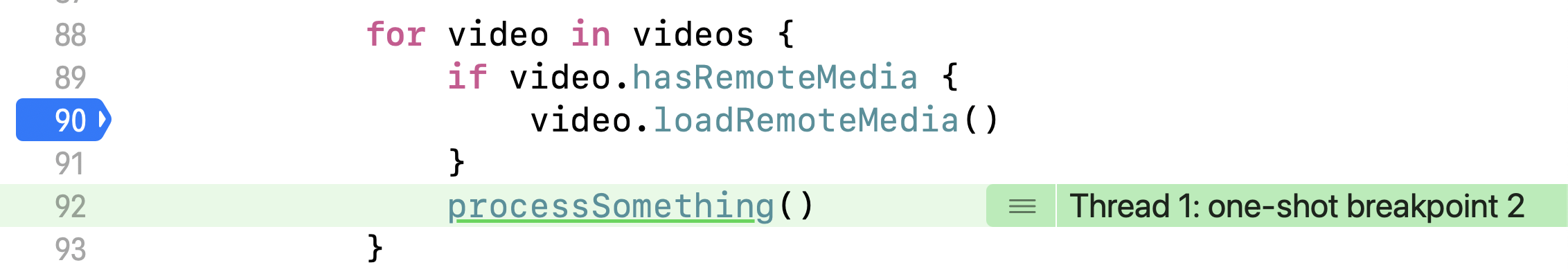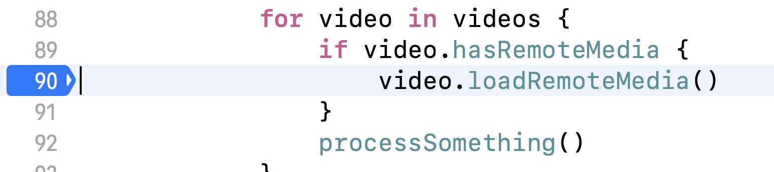 (우리는 for-loop의 loadRemoteMedia의 action에 걸어놨으므로 loadRemoteMedia가 불릴 때 마다 임시 breakpoint가 생성되어 processSomething에서도 한번 중단하게 된다.)