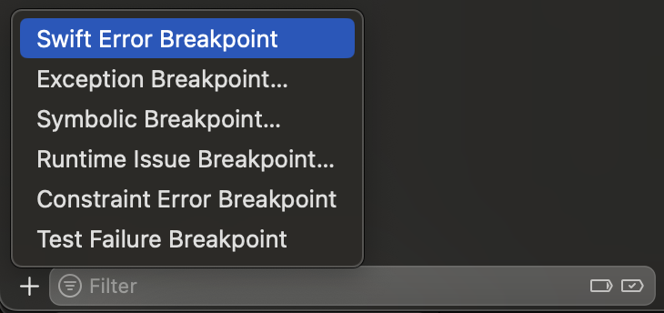 3. 왼쪽 하단의 +버튼 > Swift Error Breakpoint 를 추가한다.