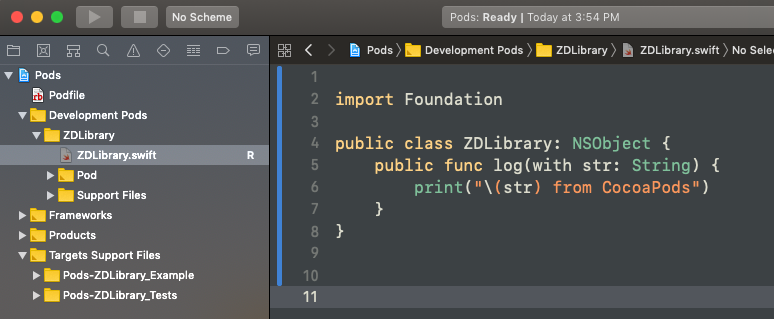 어느 프로젝트를 열어도 상관없습니다. 암튼 Pods프로젝트 > Development Pods > 내 라이브러리 이름 > 으로 가면 ReplaceMe.swift라는 게 있을 건데, 저는 거기에 그냥 위 코드를 넣어줬습니다.