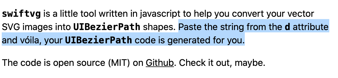 Convert SVG path data to a Swift 3 UIBezierPath As an iOS developer, you have to support at least three different pixel densities. Why waste your time managing a million image assets for different resolutions and states? swiftvg is a little tool written in