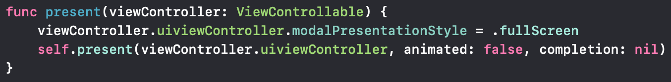 그럼 RootViewController에서 Present를 해주어야하니까 Present 메소드를 구현해줍시다. RootViewController에 바로 구현을 하는 것도 좋지만..이것도 프로토콜 메소드를 사용해야합니다.
