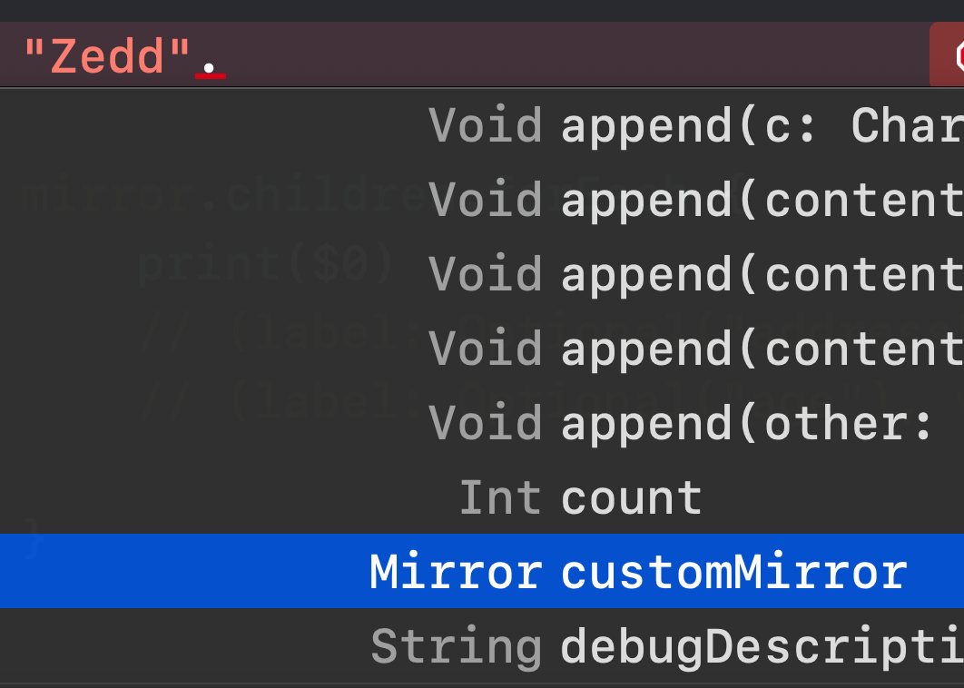 우리 지금 Mirror타입을 인스턴스 했기 때문에, Mirror의 인스턴스 프로퍼티에 접근이 가능해집니다.
