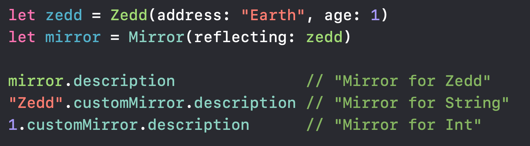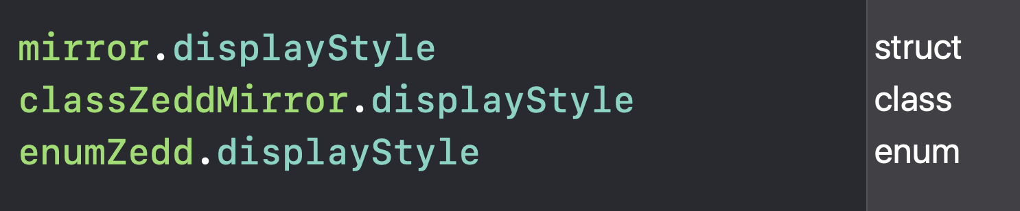 Swift에서 reflection은 바로 위에서 말한 Mirror API를 통해 제공됩니다.