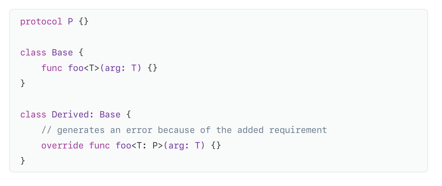 - class constraint을 제약하지않은 class-constrained protocol extension은 이제 제약조건을 암시적으로 유추.