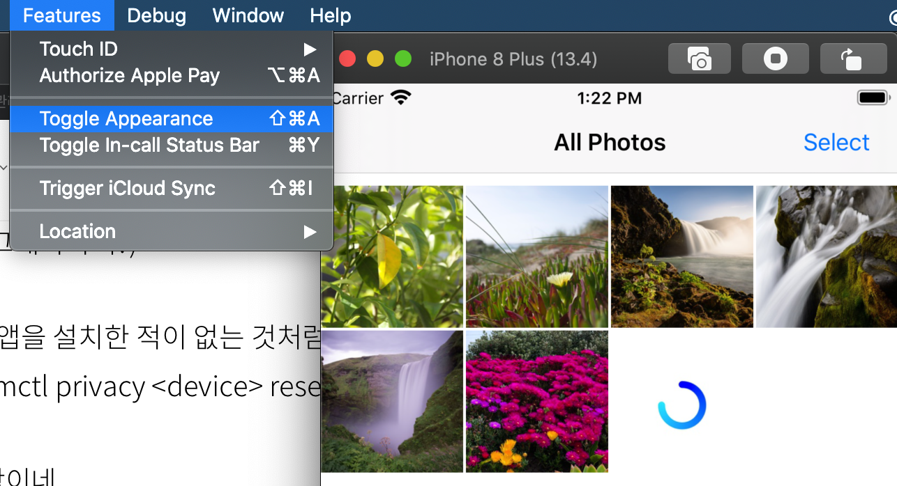 시뮬레이터는 iOS simulators(13.0+)의 appearance toggling을 지원. 앱 내에서 debug > Toggle Appearance를 선택. 커맨드로도 가능. dark appearance로 셋할려면