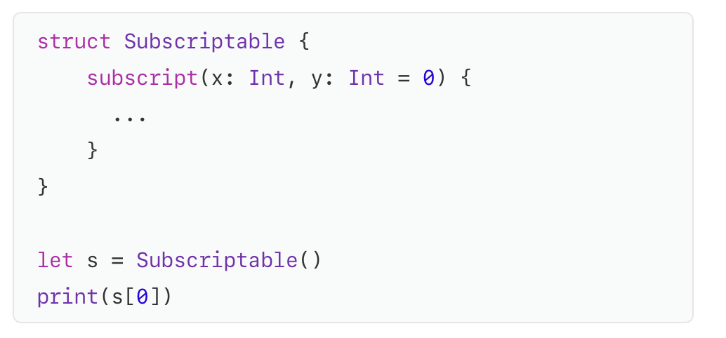 - 이제 Subscripts는 default arguments를 선언할 수 있음.