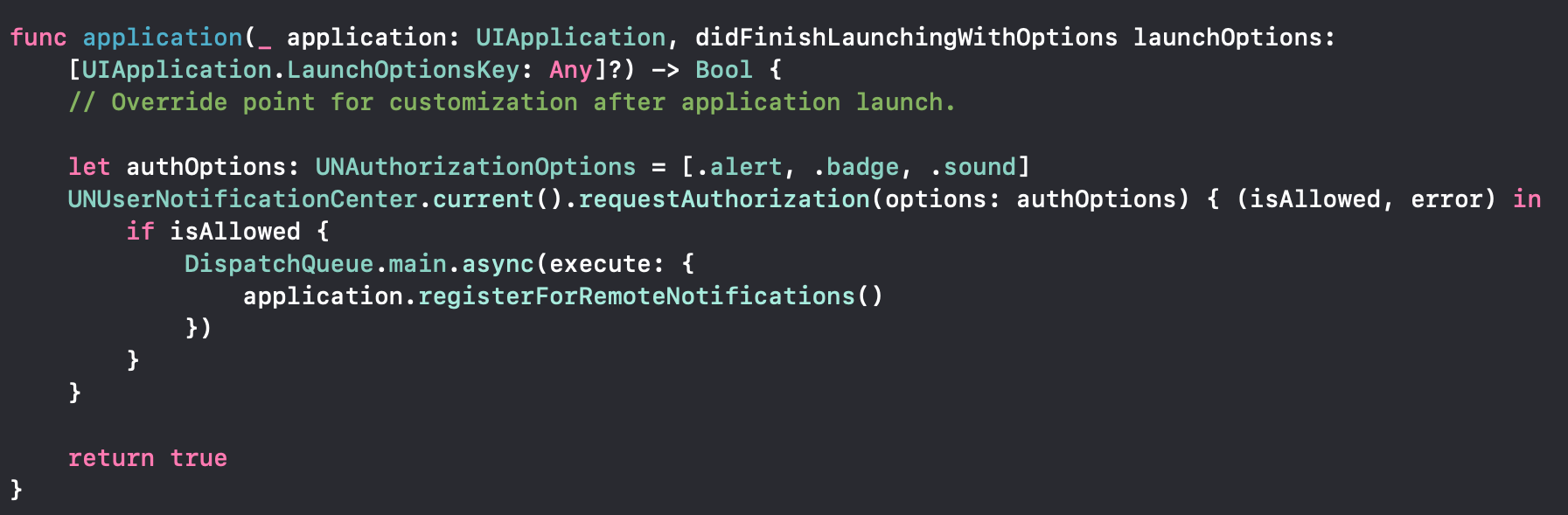 let authOptions: UNAuthorizationOptions = [.alert, .badge, .sound]
