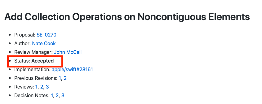 Swift evolution의 proposals에 가면 이렇게 status가 Accepted인 친구들이 있어요~