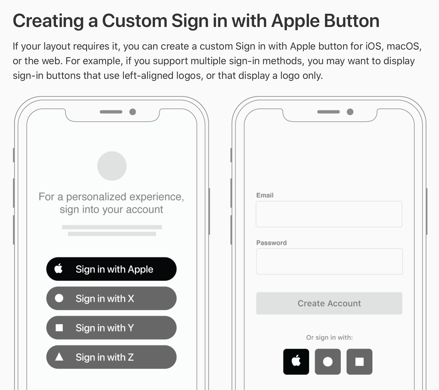 Buttons Apple provides several Sign in with Apple buttons you can use to let people set up an account and sign in. If necessary, you can create a custom button to offer Sign in with Apple; for guidelines, see Creating a Custom Sign in with Apple Button. Pr