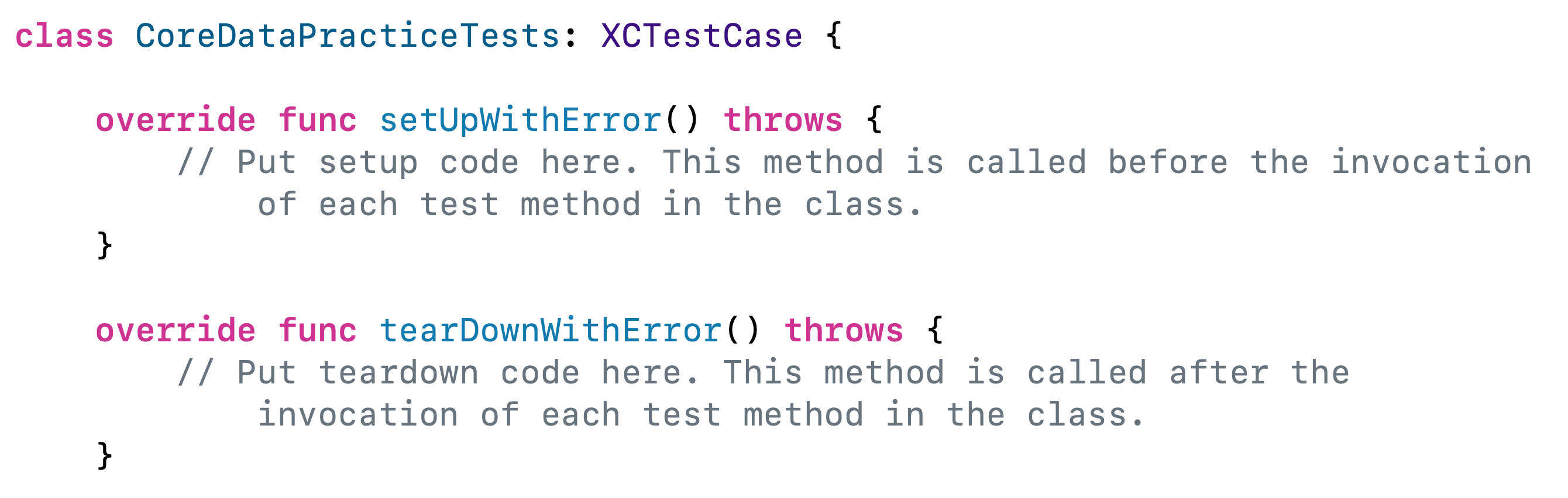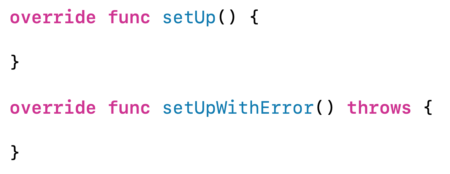 setUpWithError, tearDownWithError에서 에러를 던질 수 있게 바뀌었다는 것만 빼면 다 똑같아요.