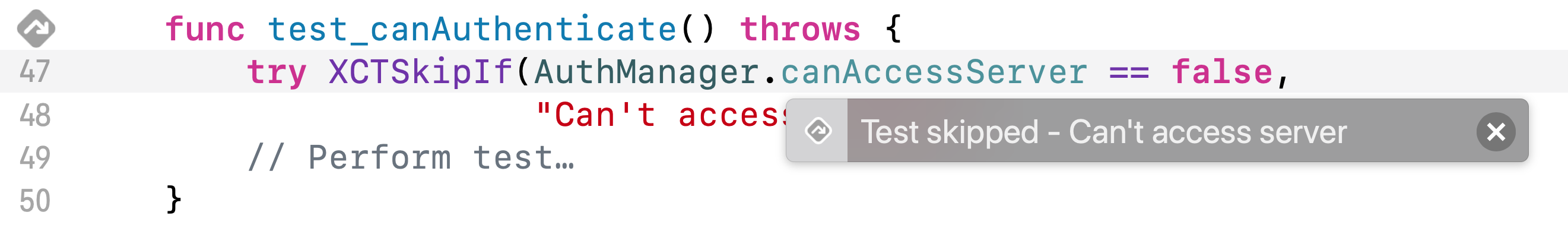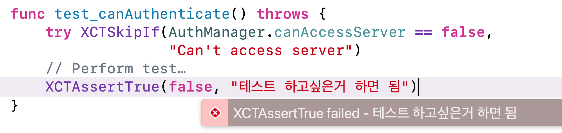 만약에 AuthManager.canAccessServer가 true에요! 근데 XCTSkipUnless를 썼네요.