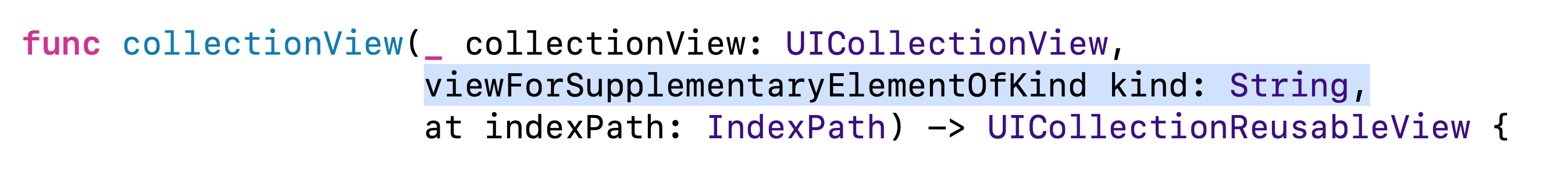 func collectionView(_ collectionView: UICollectionView, viewForSupplementaryElementOfKind kind: String, at indexPath: IndexPath) -> UICollectionReusableView