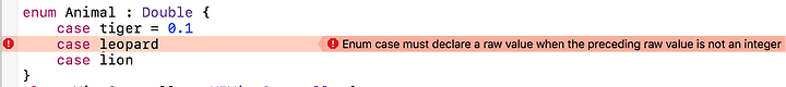 앞 case tiger에서 0.1을 원시값으로 지정해주었죠?컴파일러는 leopard의 원시값을 어떤 값으로 줘야할지 몰라서 나는 에러입니다. 1을 주어야 할지, 1.1을 주어야 할지 컴파일러는 모르겠죠?